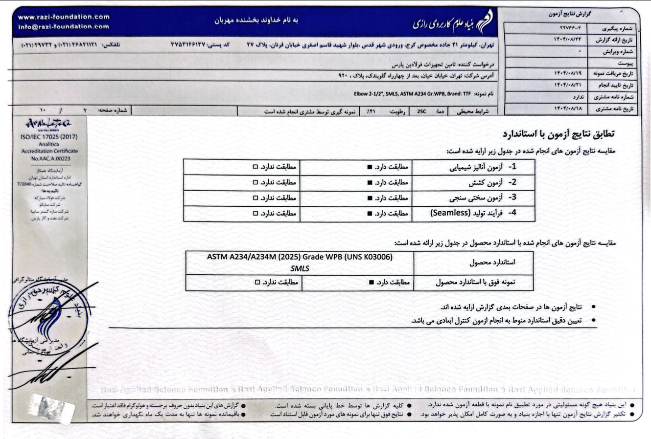 واحد کنترل کیفیت، گزارشهای دقیق آزمونهای مختلف را در قالب گواهی 3.1 EN10204 به مشتریان ارائه میدهد تا فرآیند خرید اتصالات TTF با شفافیت کامل همراه باشد.